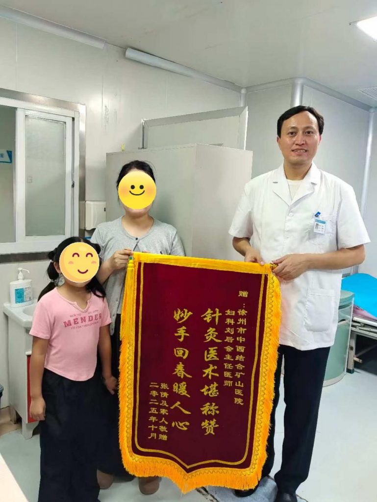 近日,位于江苏省徐州市市区西关的中煤第五建设公司职工医院中医科的诊室里洋溢着浓浓的暖意和欢笑声,康复患者李阿姨和家人来送锦旗,“感谢刘后会主任治好了折磨我多年的肩袖疼痛,还化解了我的抑郁情绪,我现在能抱孩子、能干活、能跳舞了,真是太高兴了!”李阿姨和家人连声说着“谢谢”,锦旗上醒目的8个大字——“医德高尚 医术精湛”正是对刘后会主任的高度肯定和赞扬。