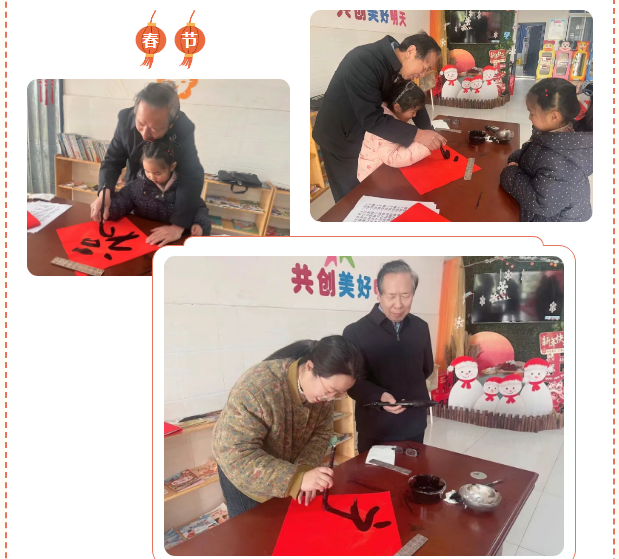 活动筹备阶段,幼儿园早已被浓浓的年味儿包裹:大红的宣纸整齐叠放如红云,砚台里墨汁研磨得细腻温润,氤氲的墨香与廊下悬挂的红灯笼、窗上张贴的福字相映成趣,一步一景皆透着新春的喜庆。受邀而来的白老师早早抵达活动现场,细心调试笔墨、构思联句,抬手落笔间尽显书法大家的深厚功底,提前为活动酝酿出雅致的文化氛围。