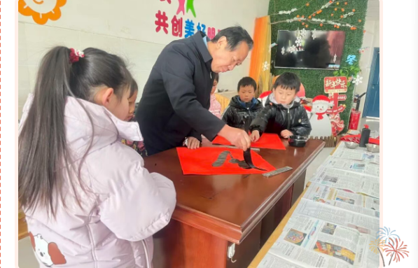 “一帆风顺年年好,万事如意步步高”“春回大地千山秀,福降人间万户欢”“马跃前程添锦绣,家迎喜气溢门庭”……一幅幅寓意吉祥的春联,一个个圆润饱满、遒劲有力的“福”字,在白老师的笔下接连诞生。孩子们小心翼翼地捧着刚写好的春联与福字,生怕墨汁沾染,脸上洋溢着自豪与喜悦,纷纷拉着老师合影留念,一张张笑脸在红宣纸的映衬下,成为新春最美的定格。