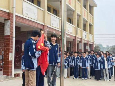 清晨,阳光洒满校园,全体师生齐聚教学楼前,参加每周一次的升旗仪式。护旗手们迈着整齐的步伐。随着雄壮的国歌,五星红旗缓缓升起,师生们面向国旗肃立致敬,整个校园沉浸在庄严肃穆的氛围中。
